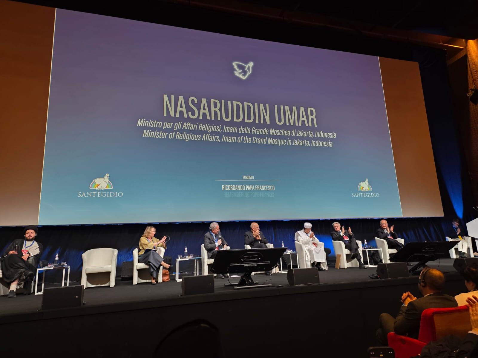 Vatikan – Roma – Menteri Agama Republik Indonesia, Prof. Dr. H. Nasaruddin Umar, M.A., menjadi salah satu pembicara utama dalam Forum Internasional untuk Perdamaian “Daring Peace” yang diselenggarakan oleh Komunitas Sant’ Egidio di Vatikan, Roma. Forum prestisius ini mempertemukan para pemimpin lintas agama dunia yang memiliki visi bersama: menebar perdamaian dan merawat kemanusiaan global.