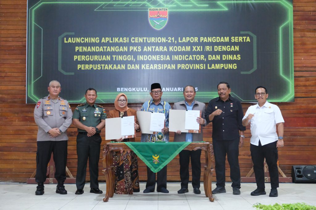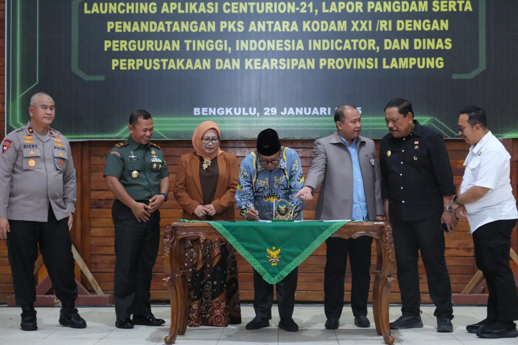 UINFASBengkulu — Universitas Islam Negeri (UIN) Fatmawati Sukarno Bengkulu secara resmi menandatangani Perjanjian Kerja Sama (MoU) dengan Tentara Nasional Indonesia Angkatan Darat (TNI AD) melalui Kodam XXI/Radin Inten dalam rangka penguatan pelaksanaan Tri Dharma Perguruan Tinggi. Penandatanganan MoU tersebut dirangkaikan dengan kegiatan Launching Aplikasi Centurion-21 dan dilaksanakan secara hybrid di Provinsi Lampung dan Balai Prajurit Provinsi Bengkulu, Kamis (29/1/2026).