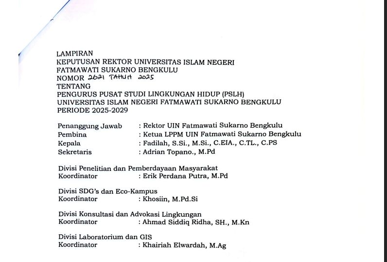 Seiring dengan pendirian lembaga tersebut, Rektor UIN Fatmawati Sukarno Bengkulu menetapkan pengurus PSLH periode 2025–2029. Struktur pengelola dirancang secara multidisipliner, mencakup bidang penelitian, pemberdayaan masyarakat, pengembangan eco-campus dan SDGs, konsultasi dan advokasi lingkungan, serta penguatan laboratorium dan sistem informasi geografis (GIS).